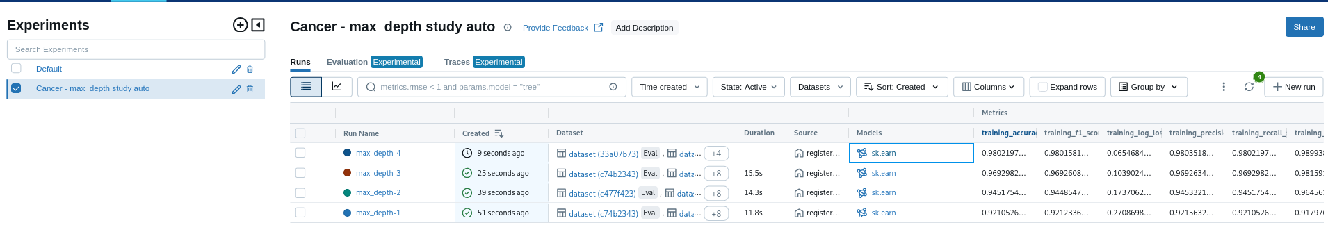 mlflow.set_experiment("Cancer - max_depth study auto")